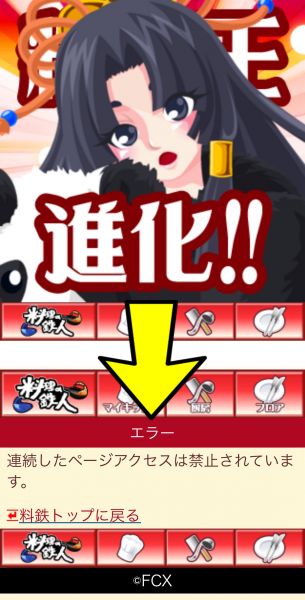 ・料理王が進化する画面の次は「エラー 連続したページアクセスは禁止されています。」というページになる